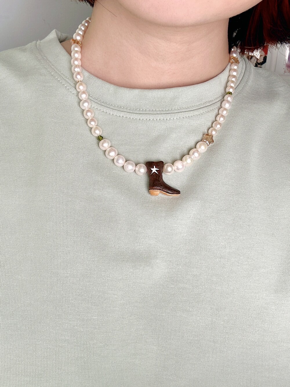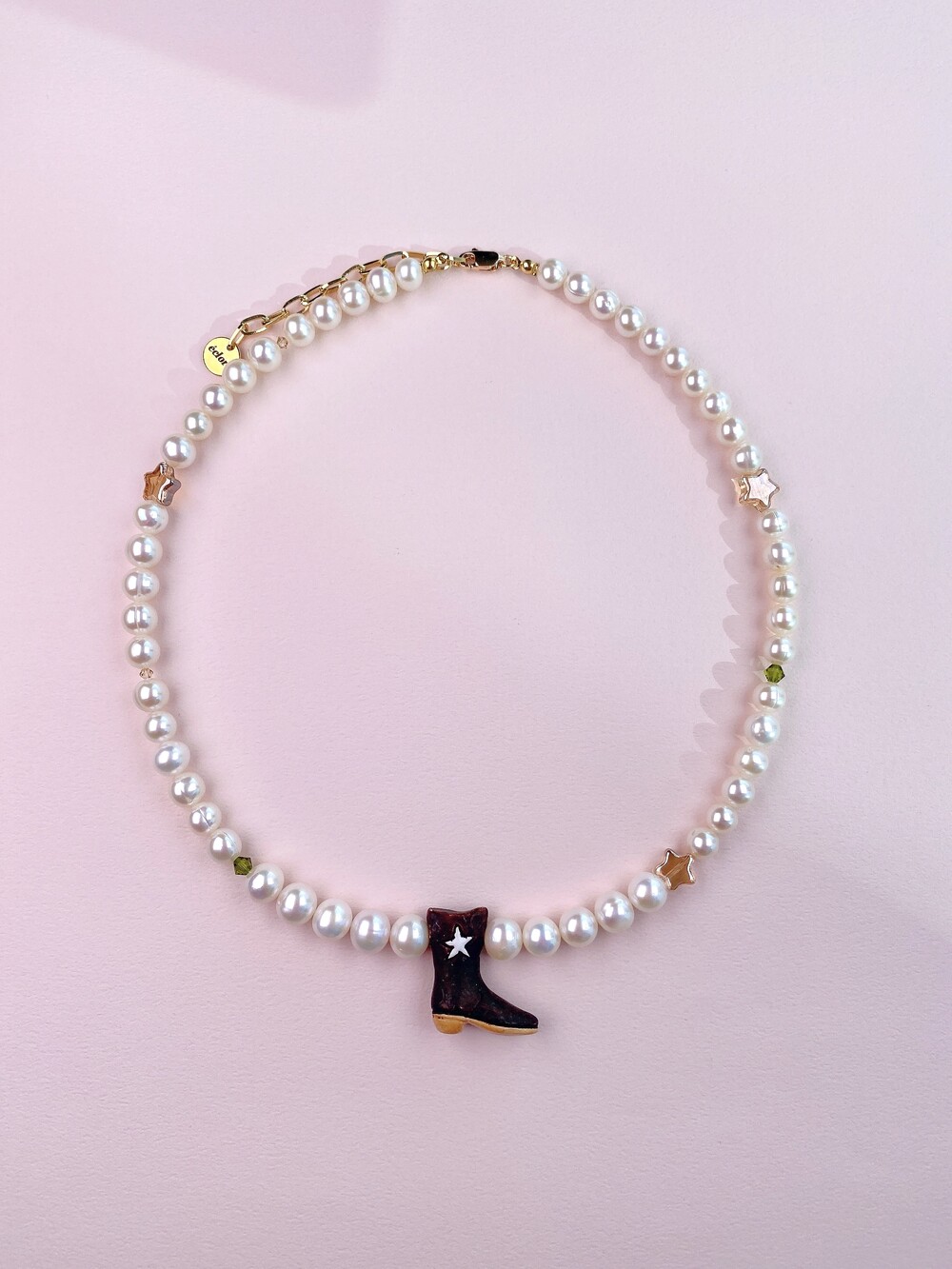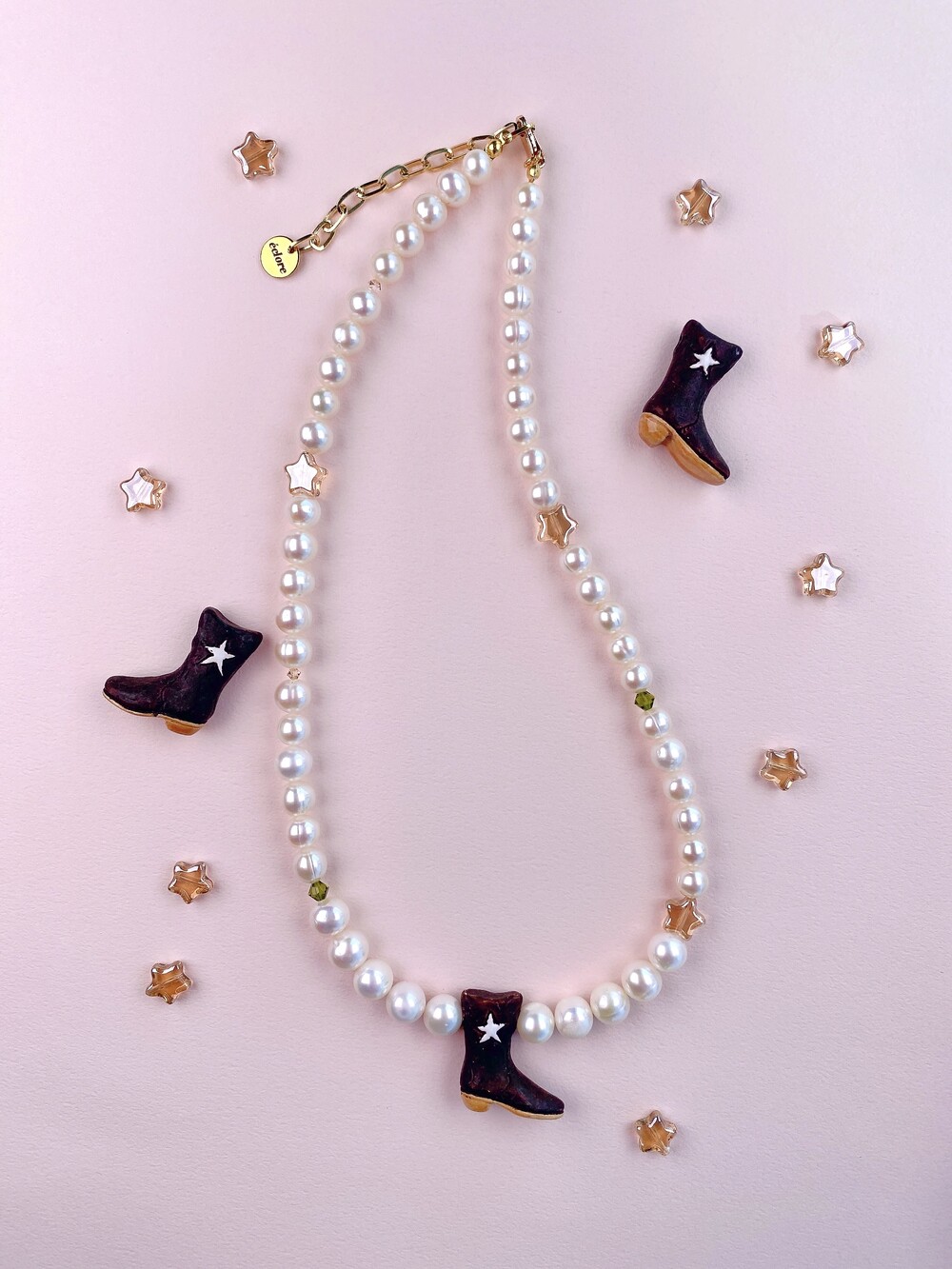 핸드메이드로 제작된 카우보이 부츠가 포인트로 들어간 담수진주 제품입니다. 스와로브스키 비즈로 중간중간 컬러 포인트가 들어가있습니다.