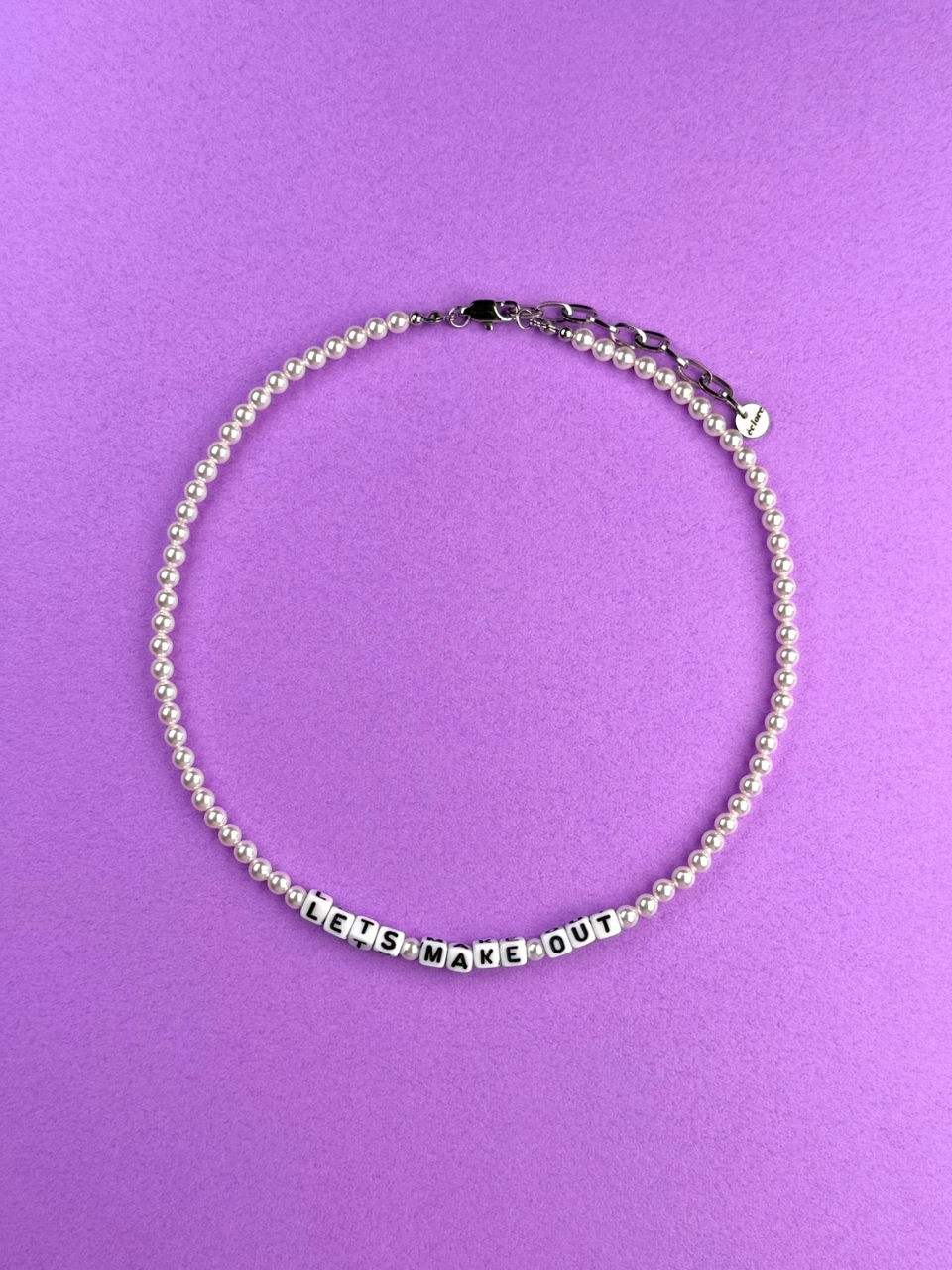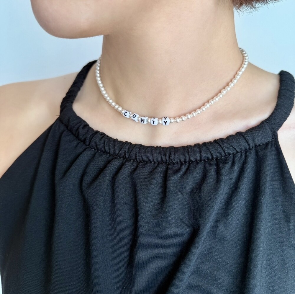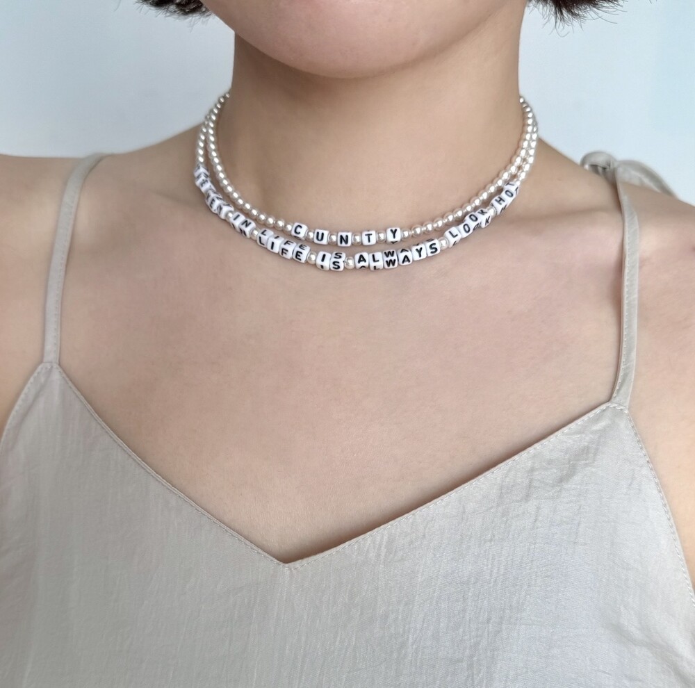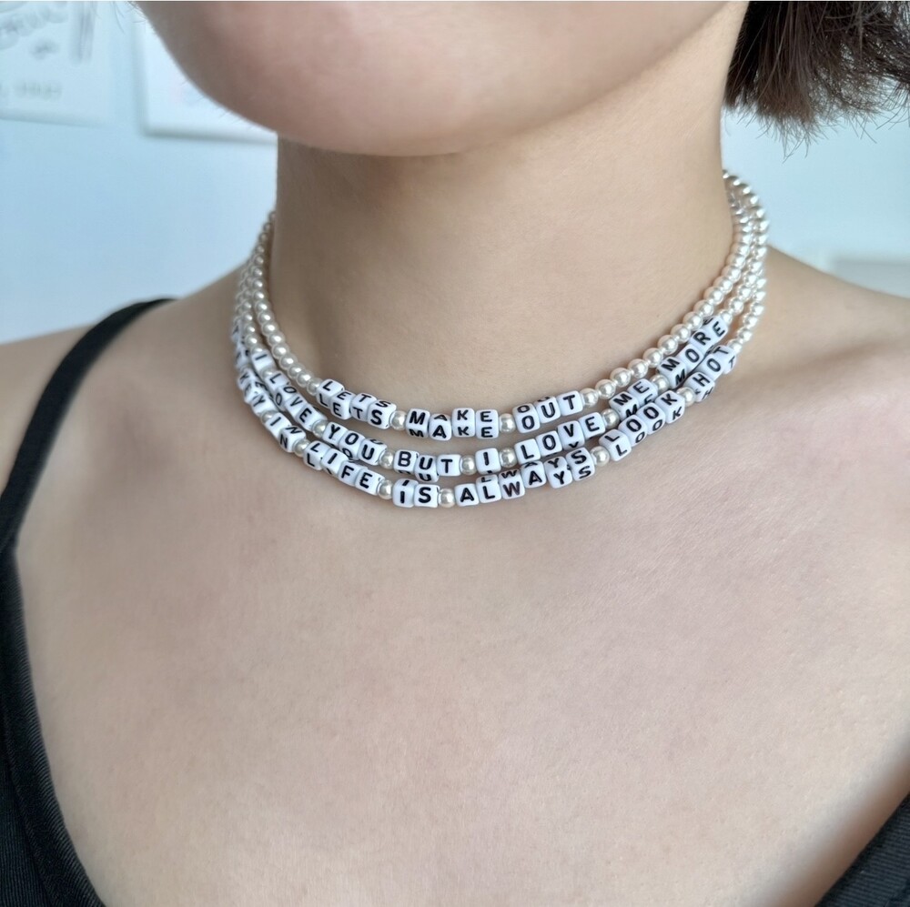사진의 예시처럼 짦은 단어 혹은 평소에 좋아하는 문장까지 본인만의 색깔을 담을 수 있는 진주 목걸이 입니다.