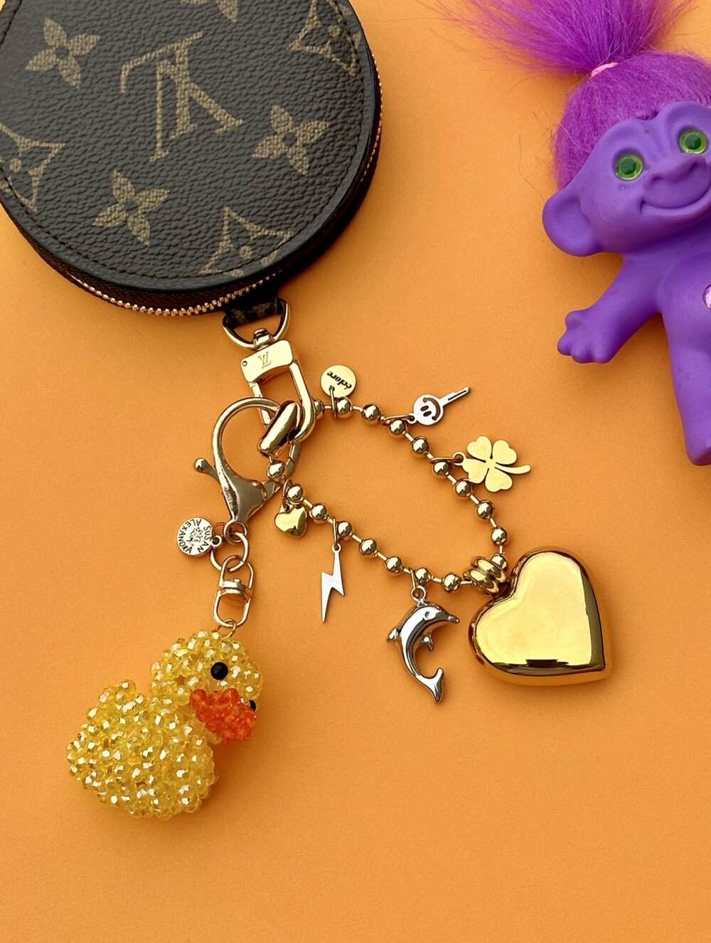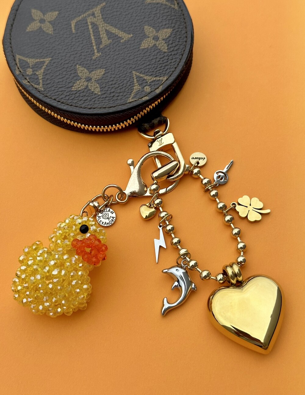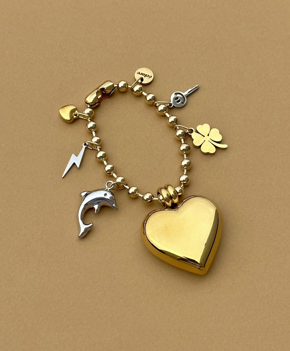 에끌로 베스트 셀러인 하트 키체인을 모티브로 골드 컬러 하트와 돌고래 팬던트가 포인트로 들어간 키체인입니다. 내구성 좋은 써지컬 스틸로 제작된 제품입니다.
