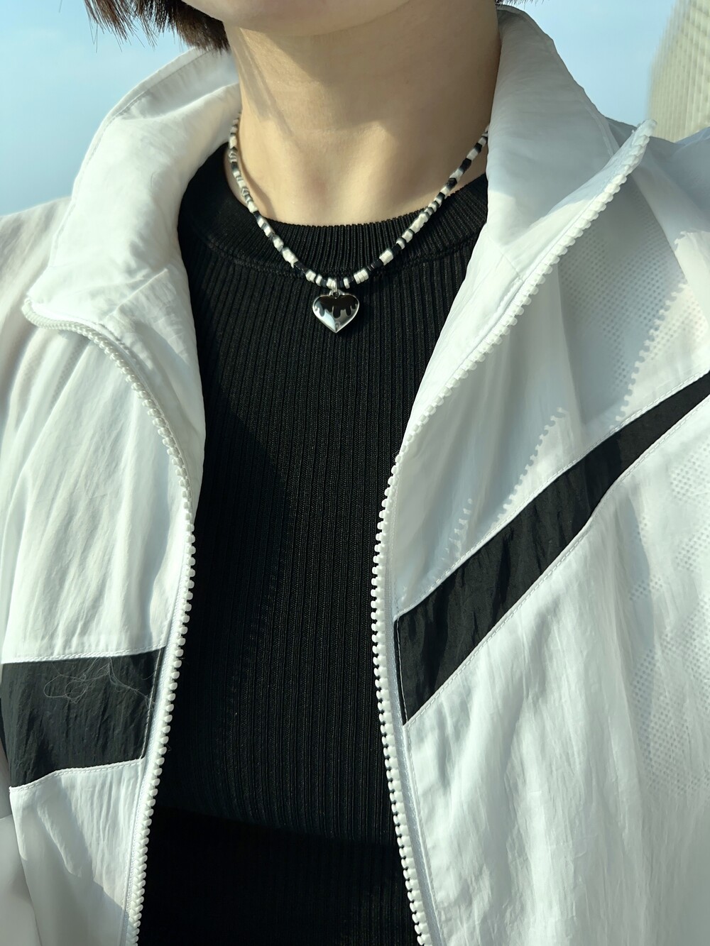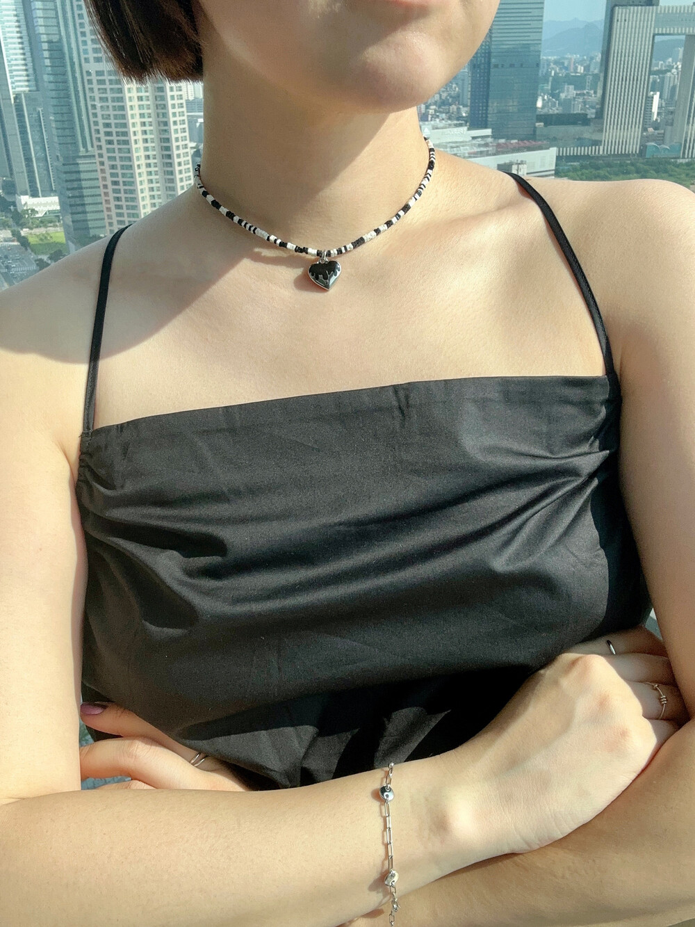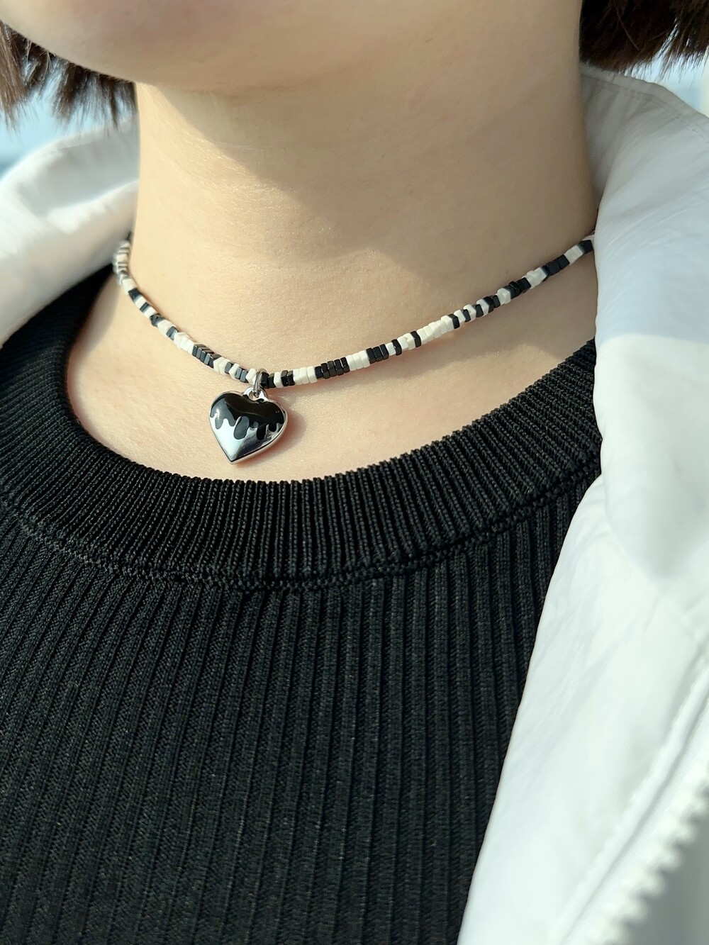 레진비즈와 써지컬스틸을 사용하여 변색이나 비즈 손상없이 오래사용 가능하시고 물놀이에도 걱정없는 제품입니다. 초커느낌으로 사용가능하시고 꼬리체인으로 일반 목걸이 길이로도 사용 가능하십니다. 흑백컬러 믹스는 랜덤으로 되어있어요.