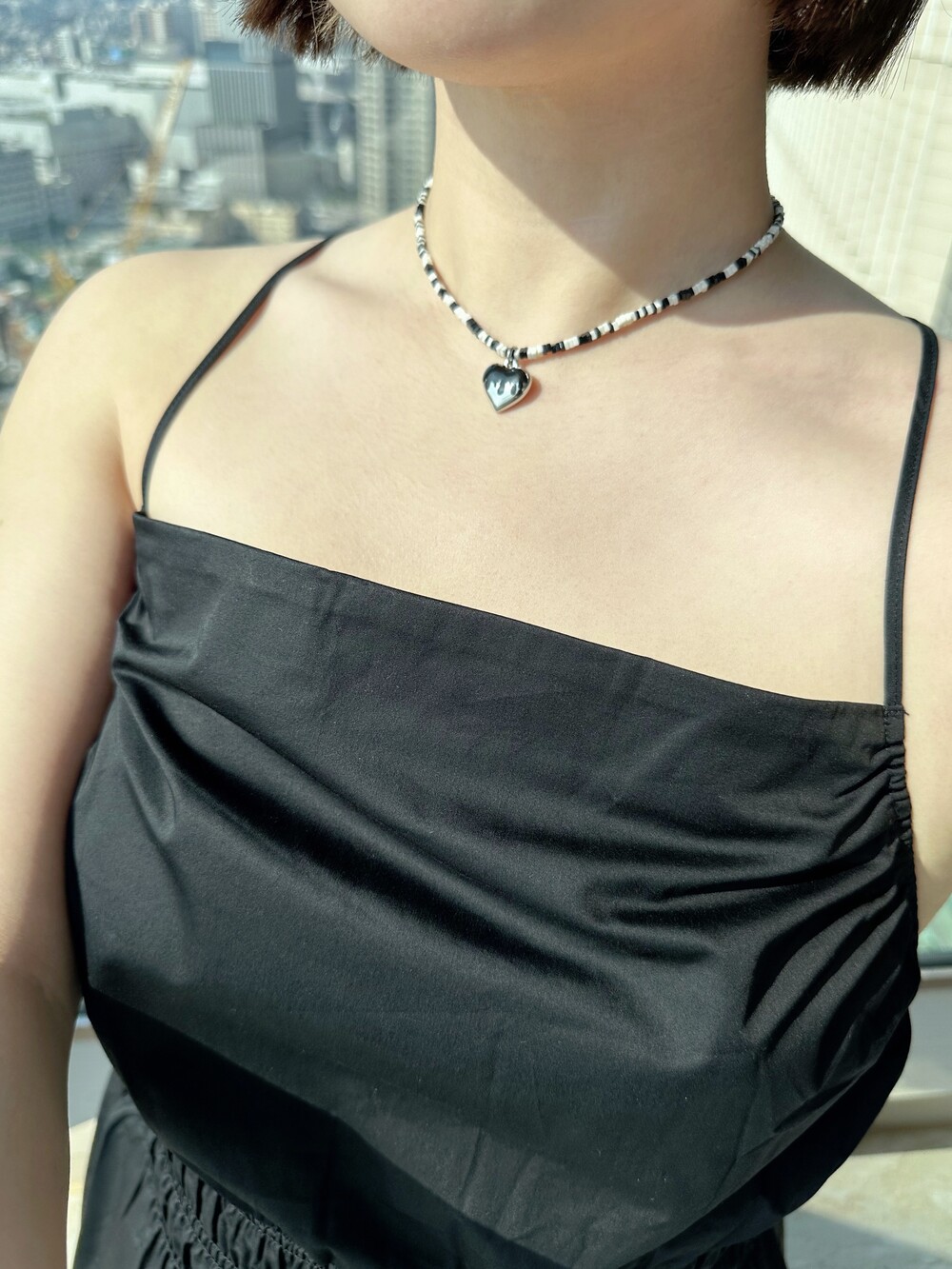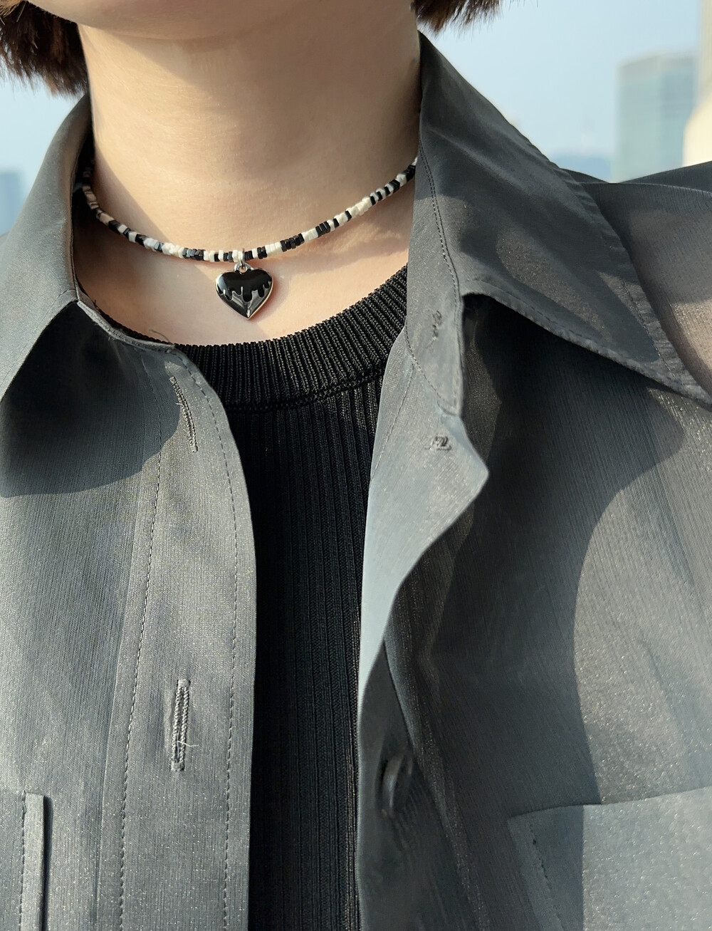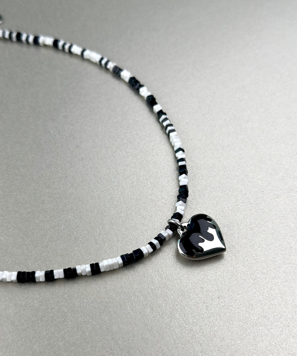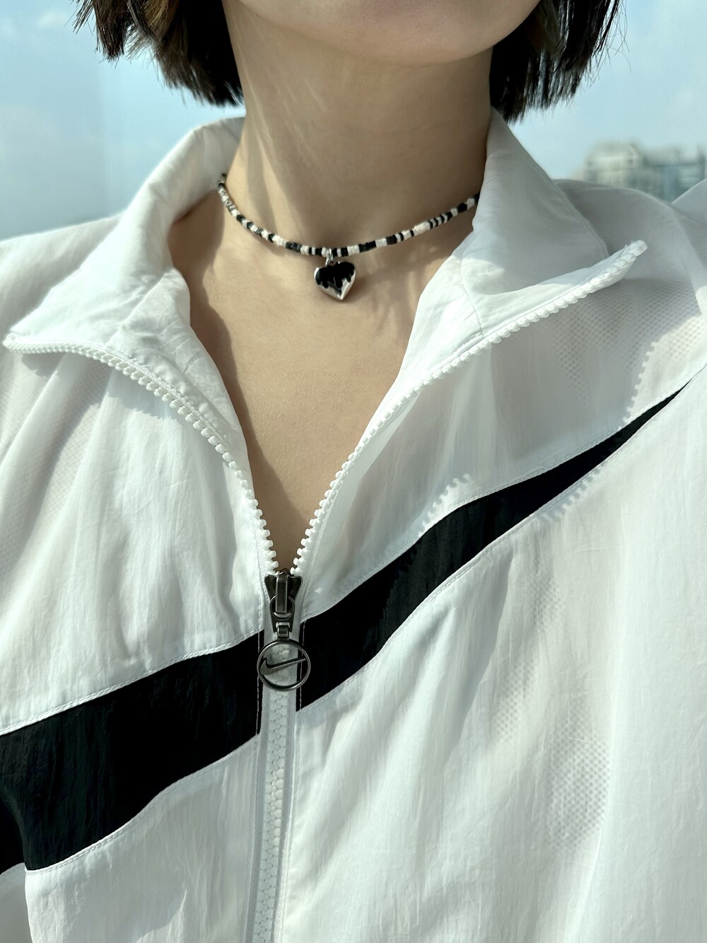 레진비즈와 써지컬스틸을 사용하여 변색이나 비즈 손상없이 오래사용 가능하시고 물놀이에도 걱정없는 제품입니다. 초커느낌으로 사용가능하시고 꼬리체인으로 일반 목걸이 길이로도 사용 가능하십니다. 흑백컬러 믹스는 랜덤으로 되어있어요.