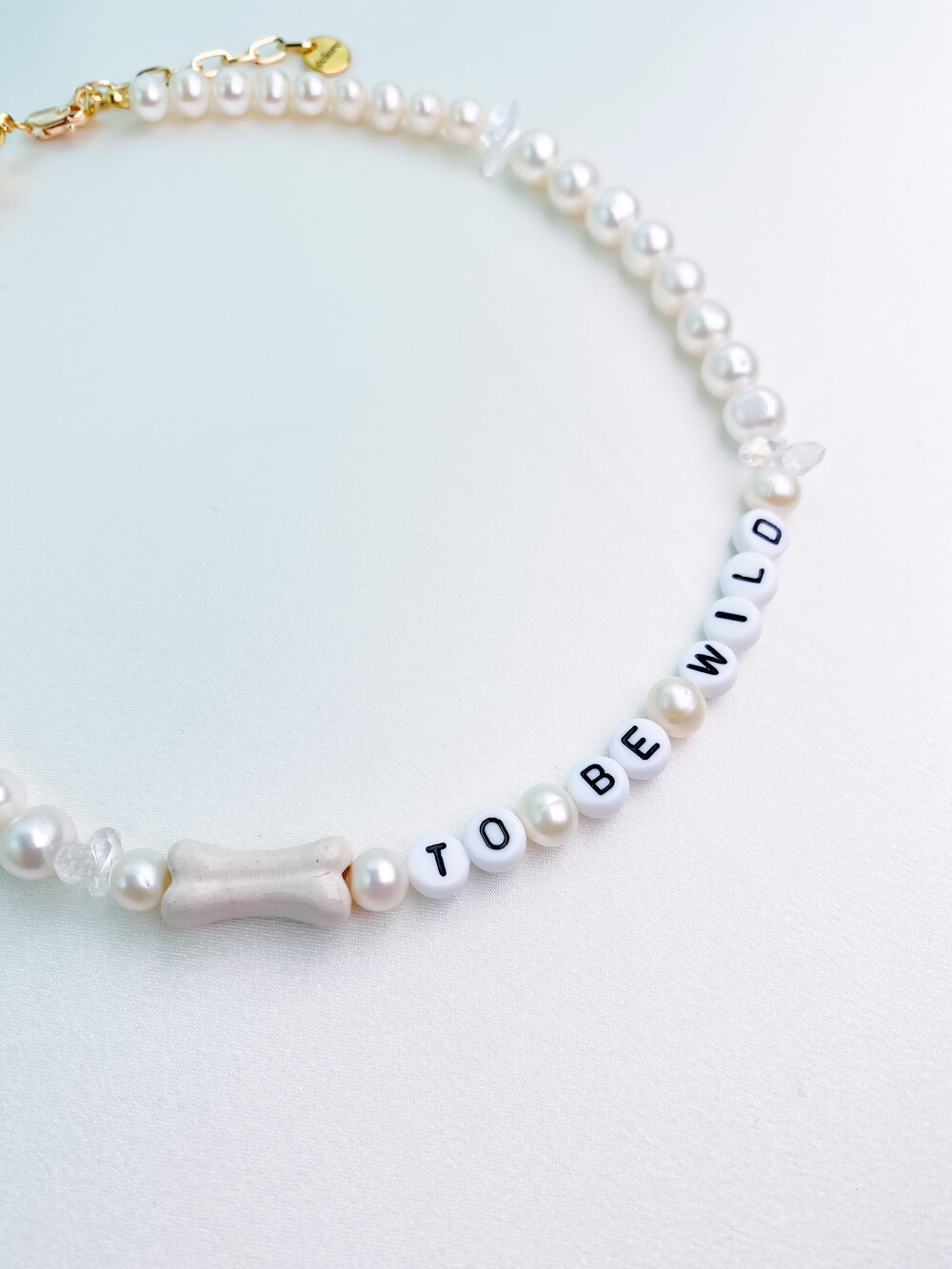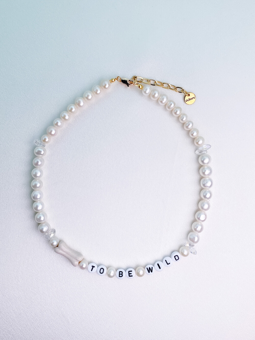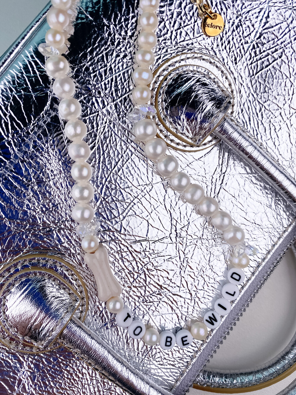 Materials: Fresh water pearls, crystal beads, ceramic peruvian bead, 14k gold plated clasps, brass chains, stainless steel éclore logo.