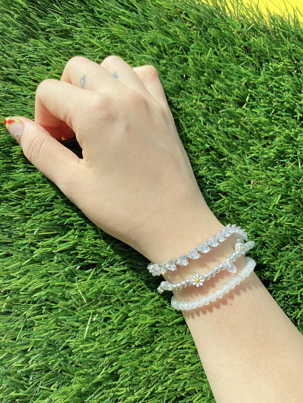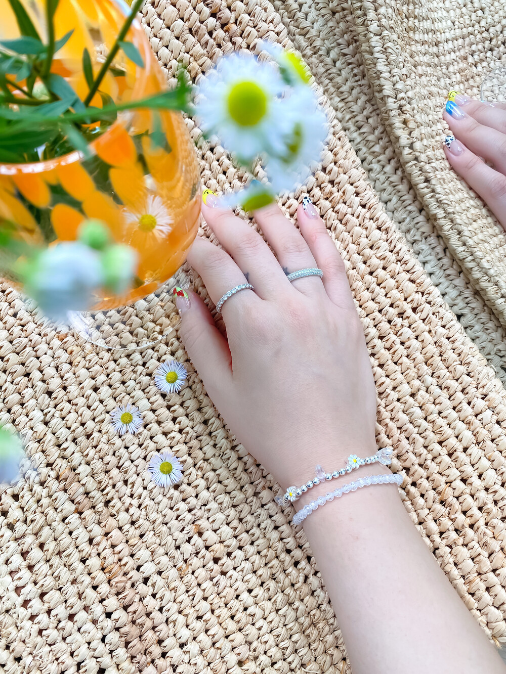 중량감 있는 데이지 실버 팬던트와 크리스탈 비즈를 함께 넣어 제작한 실버볼 팔찌 입니다. 사진에서 처럼 The S&P bracelet와 The Gem Gem bracelet와 함께 레이어드 하시길 추천드립니다.