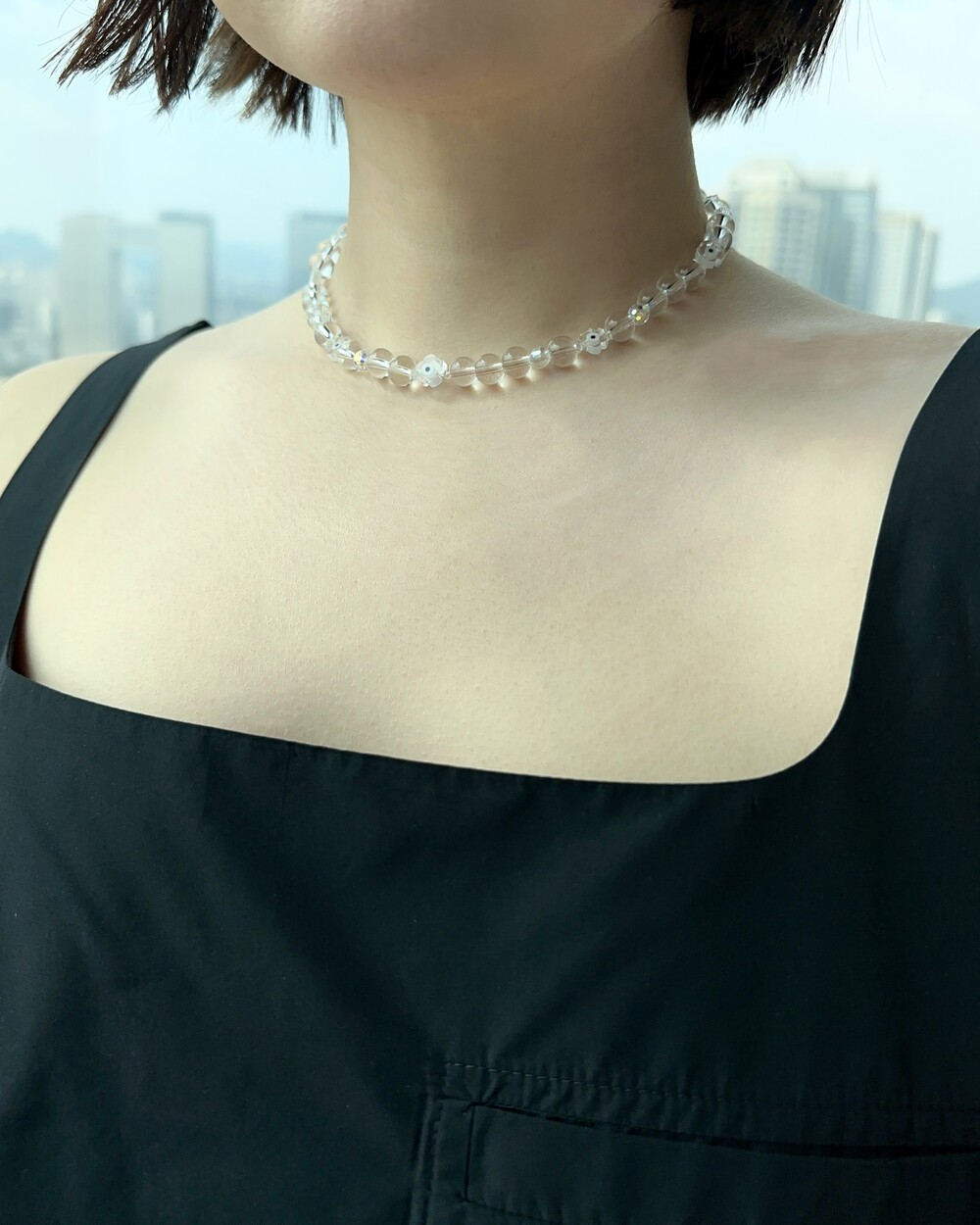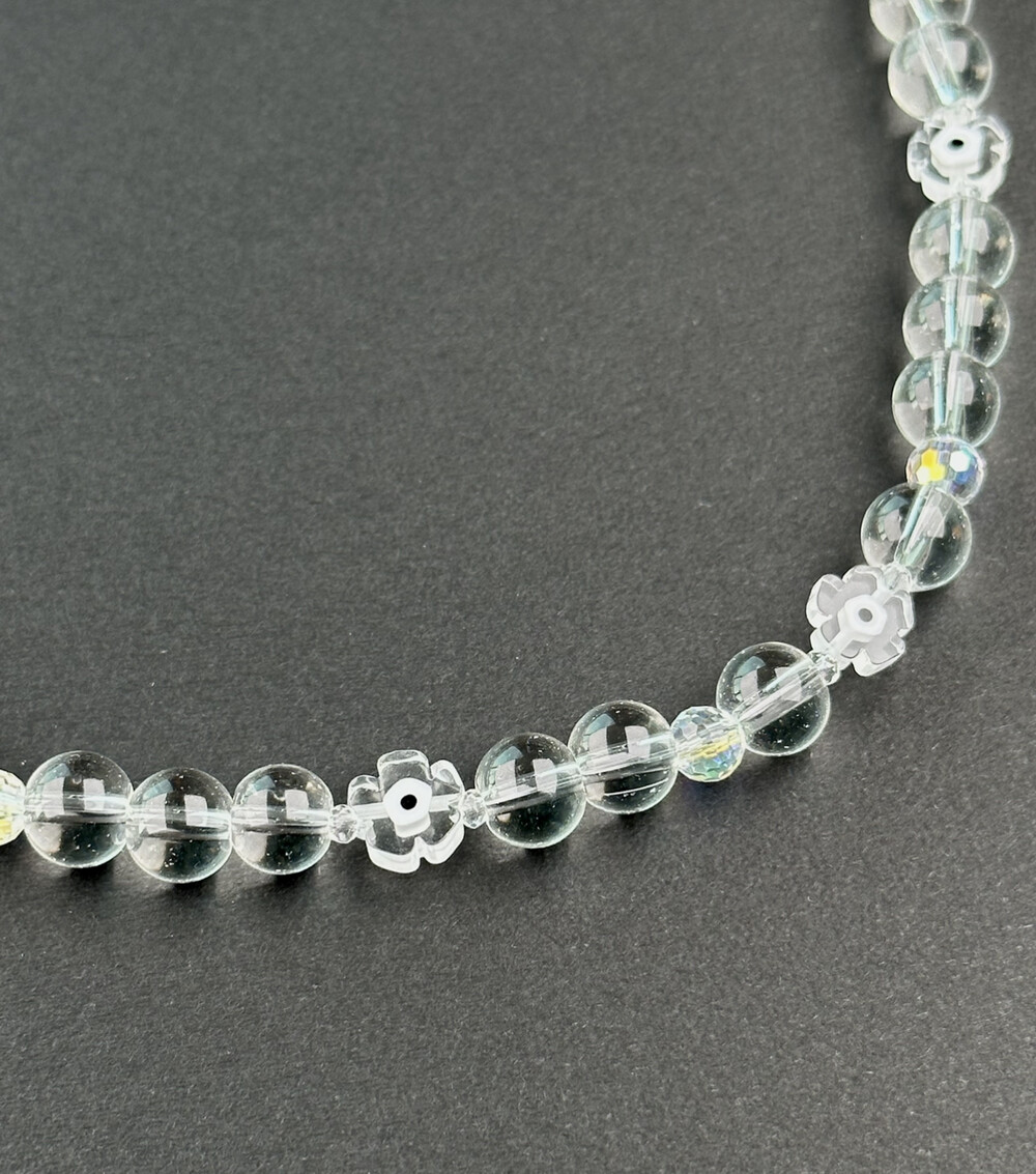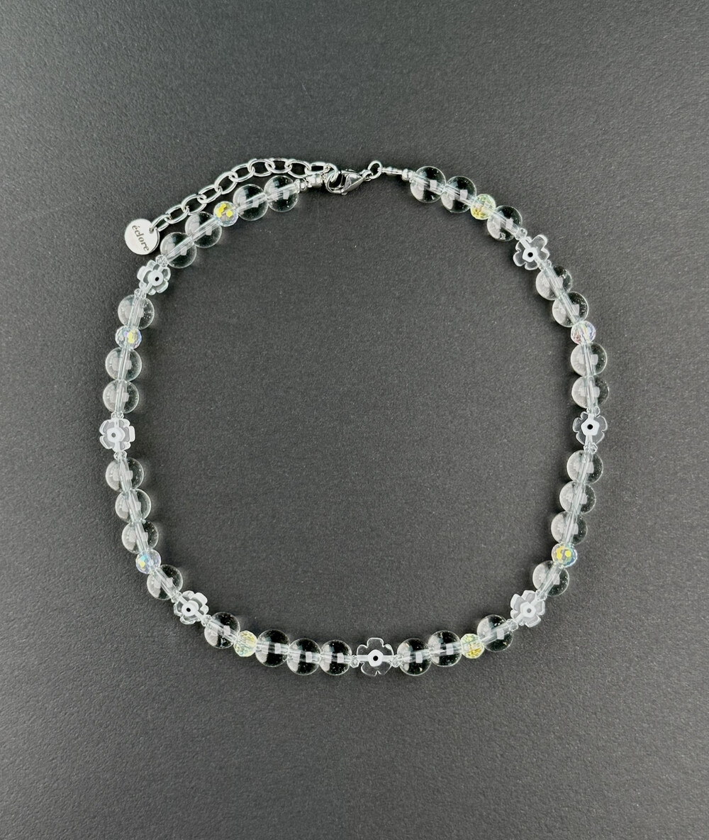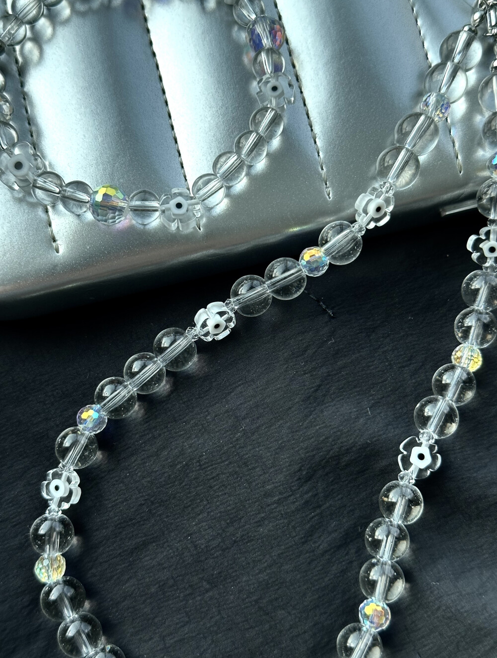 Materials: Quartz and glass mixed beads, glass beads, crystal beads, surgical steel clasp and chains.
