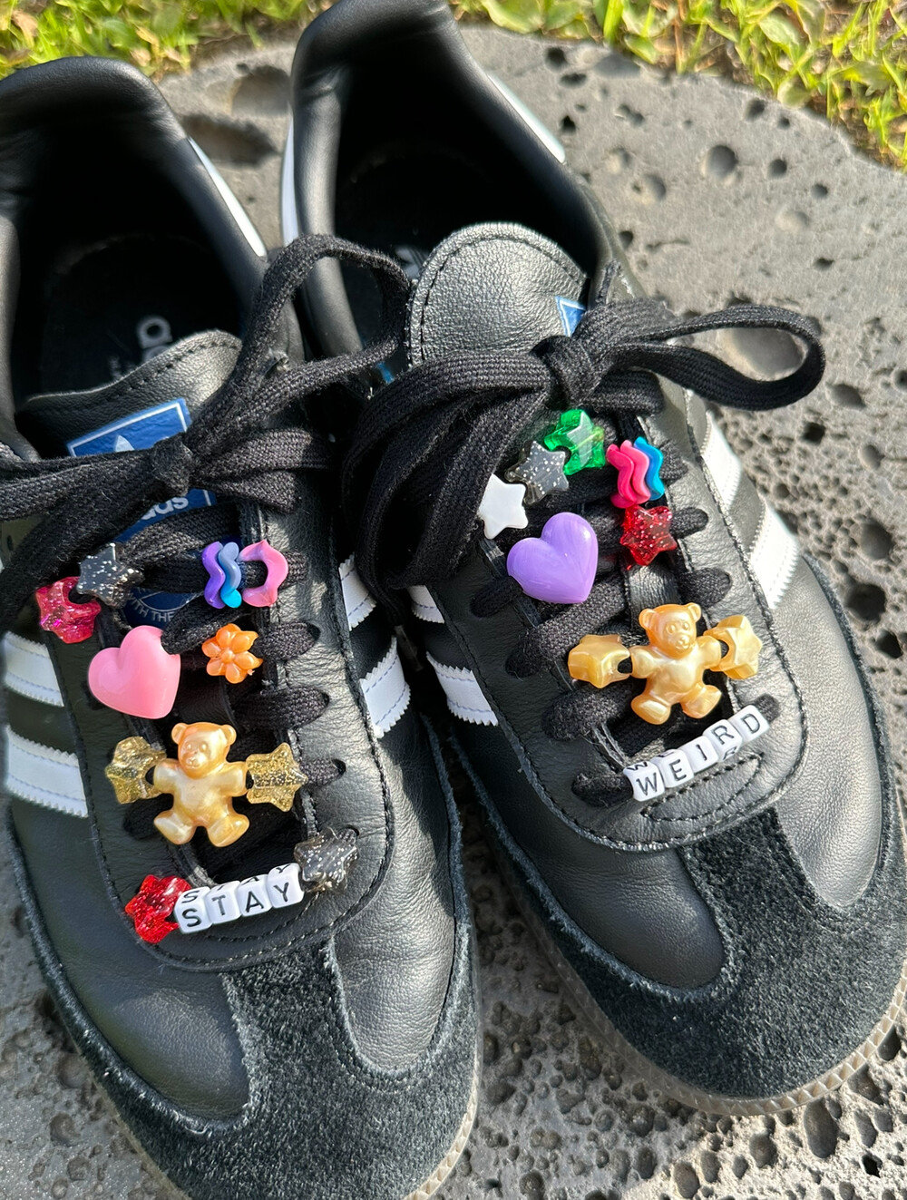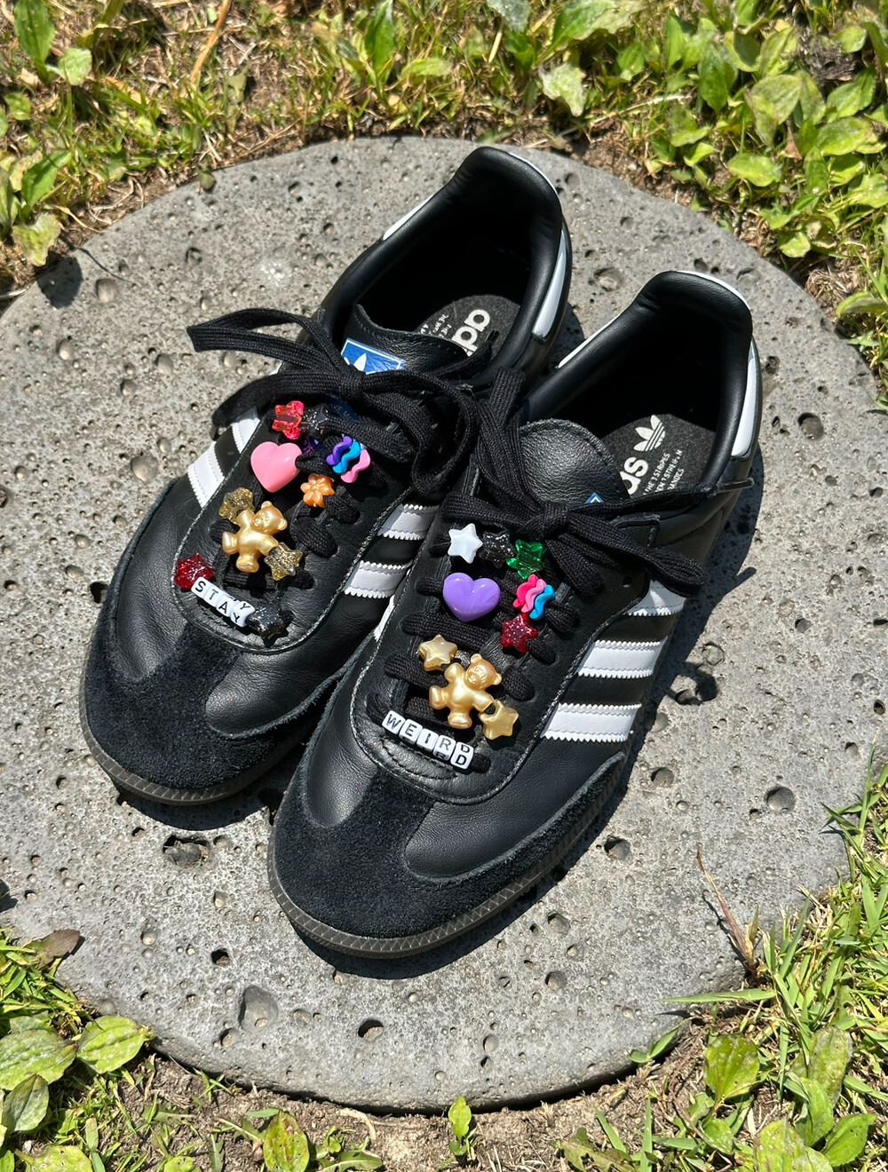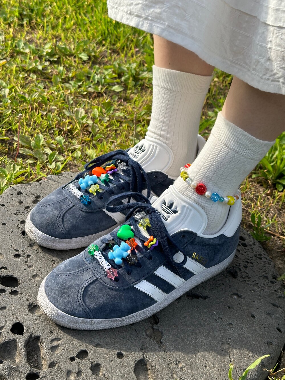 신발 끈을 풀어서 비즈와 함께 다시 꽂아주면 끝! 예시 신발 사진보다 더 많은 갯수의 비즈를 보내드리니 여유롭게 사용하시고 나머지는 또 다른 신발에 포인트로 달아주세요.